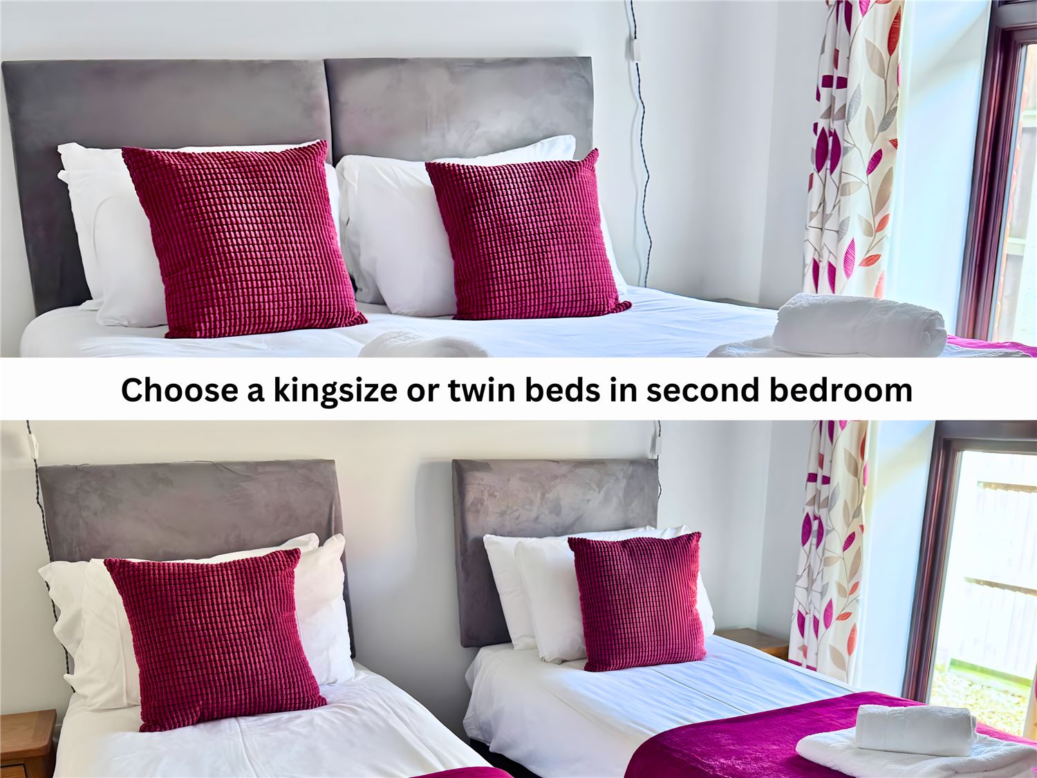 The second bedroom features zip n link beds and can be configured as a second kingsize or a twin room.